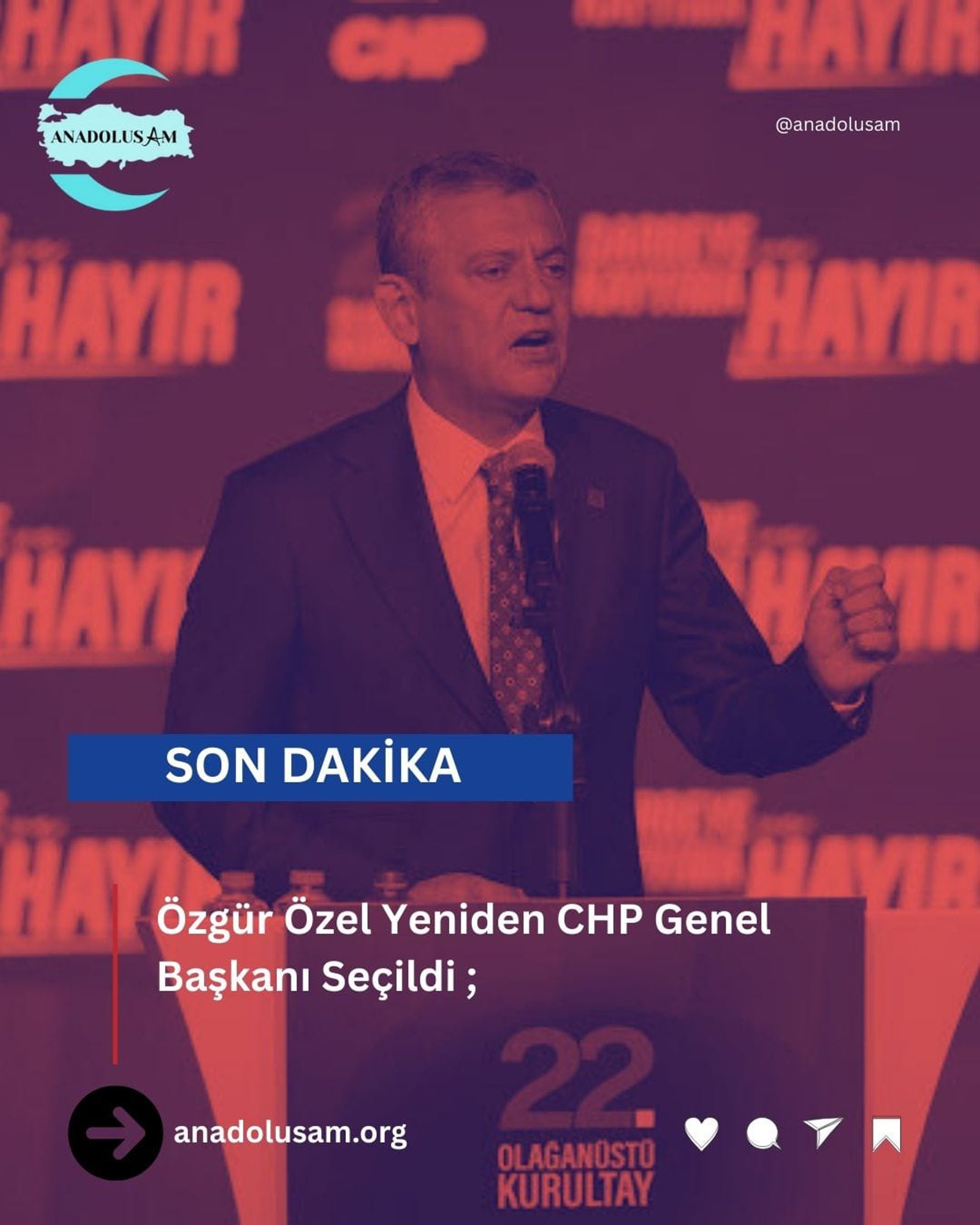 Cumhuriyet Halk Partisi’nin 22. Olağanüstü Kurultayı’nda delegeler yeniden Özgür Özel’i genel başkanlığa seçti. Kurultayda tek aday olarak yarışan Özel, kullanılan 917 oyun 835’inin geçerli sayıldığı seçimde tüm geçerli oyların tamamını alarak bir kez daha güven tazeledi. Böylece Özel, son iki yıl içinde üçüncü kez CHP Genel Başkanı olmuş oldu.